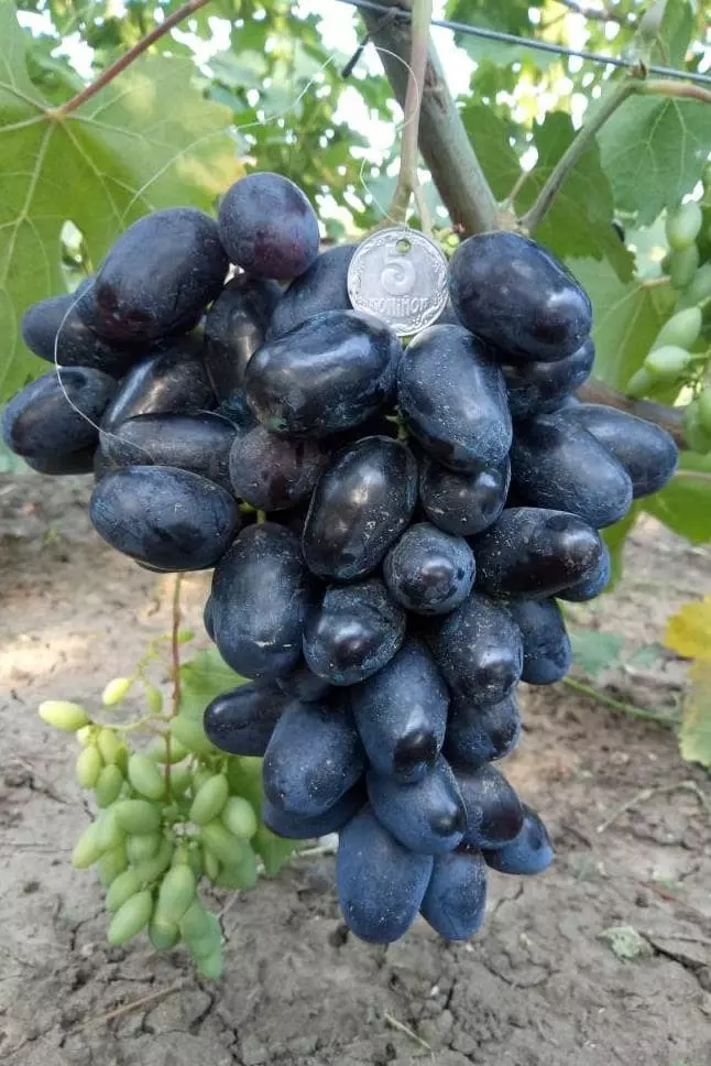 кущах грона невеликі. Ягоди чорні, овально-подовженої форми, дуже великі, середньою масою близько 12гр, окремі